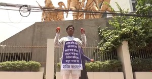 দুই হাতে দুটি পচা আপেল আর গলায় একটি প্ল্যাকার্ড নিয়ে নির্বাচন কমিশনের সামনে প্রতিবাদ জানাতে এসেছেন হানিফ বাংলাদেশি নামের এক যুবক। তাকে দেখে পথচারি...