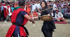 খোলা চুল, কালো পোশাক। এক হাতে লাঠি, অন্য হাতে ঢাল। কখনো লাঠির বদলে তলোয়ার। ডাগর চোখে তেজি ভাব। ছুটে চলেছেন প্রতিপক্ষের দিকে। লড়াই করছেন। এই লড়াকু...