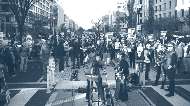 বিক্ষোভকারীরা ‘ট্রাম্পকে এখনই যেতে হবে!’ এবং ‘অভিশংসন, দণ্ডাদেশ, অপসারণ’ লেখা প্ল্যাকার্ড বহন করেন। এ সময় তারা স্লোগান দেন, ‘সাবধান, সাবধান, হোয়াইট হাউসে একজন ফ্যাসিস্ট আছেন’ এবং ‘ট্রাম্প শাসনের অবসান চাই।’