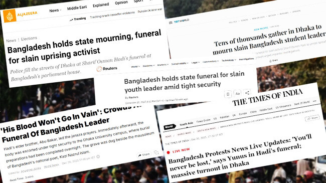 টাইমস অব ইন্ডিয়া ও এনডিটিভি: ভারতীয় এই দুই সংবাদমাধ্যম হাদির জানাজা এবং দাফনের খবরের সরাসরি আপডেট দিয়েছে। টাইমস অব ইন্ডিয়া প্রধান উপদেষ্টার বক্তব্য উদ্ধৃত করে শিরোনাম করেছে- ‘তুমি কখনো হারিয়ে যাবে না: হাদির জানাজায় ড. ইউনূস’ অন্যদিকে এনডিটিভি লিখেছে- ‘তার রক্ত বৃথা যাবে না: হাদির জানাজায় অংশ নেওয়া লাখো মানুষের কণ্ঠে স্লোগান।’