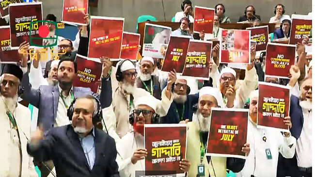 বিরোধী এমপিরা রাষ্ট্রপতির ভাষণের শুরুতেই প্রতিবাদ জানিয়ে প্লেকার্ড প্রদর্শন করেন। বিশেষ প্লেকার্ডে বাংলা ও ইংরেজিতে লেখা ছিল, ‘জুলাই আন্দোলনের সাথে বিরোধীতাকারীকে চাই না, গাদ্দার।’