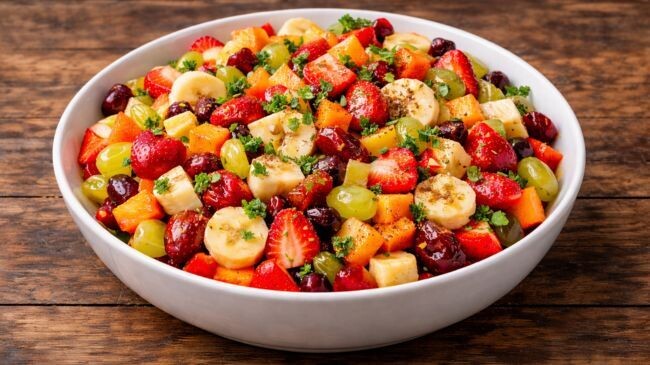 পুষ্টিগুণে ভরপুর এই সালাদ তৈরিতে আপেল, কলা, আঙুর, খেজুর এবং স্ট্রবেরির মতো ফল ব্যবহার করা যায়। মিষ্টি স্বাদ আনতে প্রাকৃতিক খেজুরের সঙ্গে টক-মিষ্টি কমলার রস ও লেবুর রস মেশালে এর স্বাদ অনন্য হয়। এছাড়া সালাদে ব্যবহৃত পুদিনাপাতা ও জিরার গুঁড়া হজম প্রক্রিয়া ত্বরান্বিত করে পেট ঠান্ডা রাখতে সহায়তা করে।