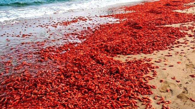 ওমানের একটি সমুদ্রসৈকতে হঠাৎ বিপুল পরিমাণ লাল রঙের মৃত চিংড়ি ভেসে আসার খবর পাওয়া গেছে। দেশটির দোফার প্রদেশের মিরবাত শহরের উপকূলে সম্প্রতি এই বিস্ময়কর ঘটনাটি ঘটে। বালুর ওপর স্তূপ হয়ে থাকা এসব সামুদ্রিক প্রাণী দেখতে অনেকটা লাল গালিচার মতো মনে হচ্ছে। তবে জনস্বাস্থ্যের কথা বিবেচনা করে সৈকতে পড়ে থাকা এসব প্রাণী কুড়িয়ে খেতে কঠোরভাবে নিষেধ করেছে সংশ্লিষ্ট কৃষি মন্ত্রণালয়।