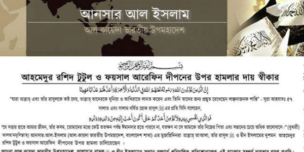 পর পর দুইটি হামলার পরেই এর দায় স্বীকার করে নিল আন্তর্জাতিকভাবে সন্ত্রাসী স্বীকৃতি পাওয়া এ সংগঠনটি। এর আগেও ইসলাম সম্পর্কে কটূক্তিকারী ব্লগার নিলয়কে হত্যা করার পরও একই স্টাইলে দায় স্বীকার করে নিয়েছিল আলকায়েদার এ উপমহাদেশ শাখা। এবারও আগের হামলার মতোই দুই প্রকাশক হামলার দায়ও স্বীকার করে নিলো এ সংগঠনটি।