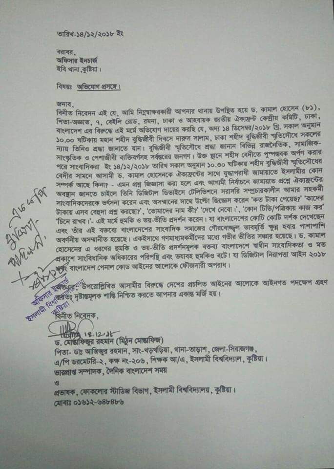 অভিযোগে ওই শিক্ষক উল্লেখ করেন, 'ঐক্যফ্রন্ট নেতা ড. কামাল হোসেনের এমন হুমকি ও ভয়ভীতি প্রদর্শনমূলক বক্তব্য বাংলাদেশের স্বাধীন সাংবাদিকতা ও মত প্রকাশে সাংবিধানিক অধিকারের পরিপন্থী এবং ভয়াবহ হুমকিও বটে। যা ডিজিটাল নিরাপত্তা আইন ২০১৮ এবং বাংলাদেশ পেনাল কোড আইনের আলোকে ফৌজদারি অপরাধ।'
